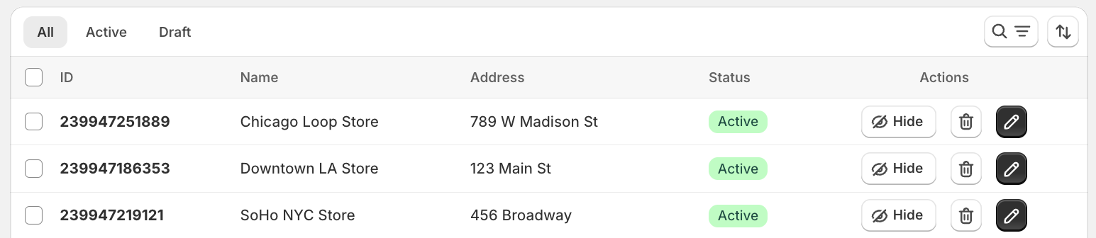 The All, Active, and Draft tabs allow you to filter locations by status: